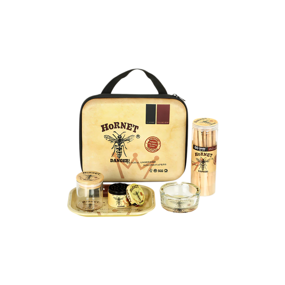 Smoking set inside includes : 110mm rolling paper, Glass jar with bamboo lid, Metal herb grinder, Rolling Tray, Ashtray.