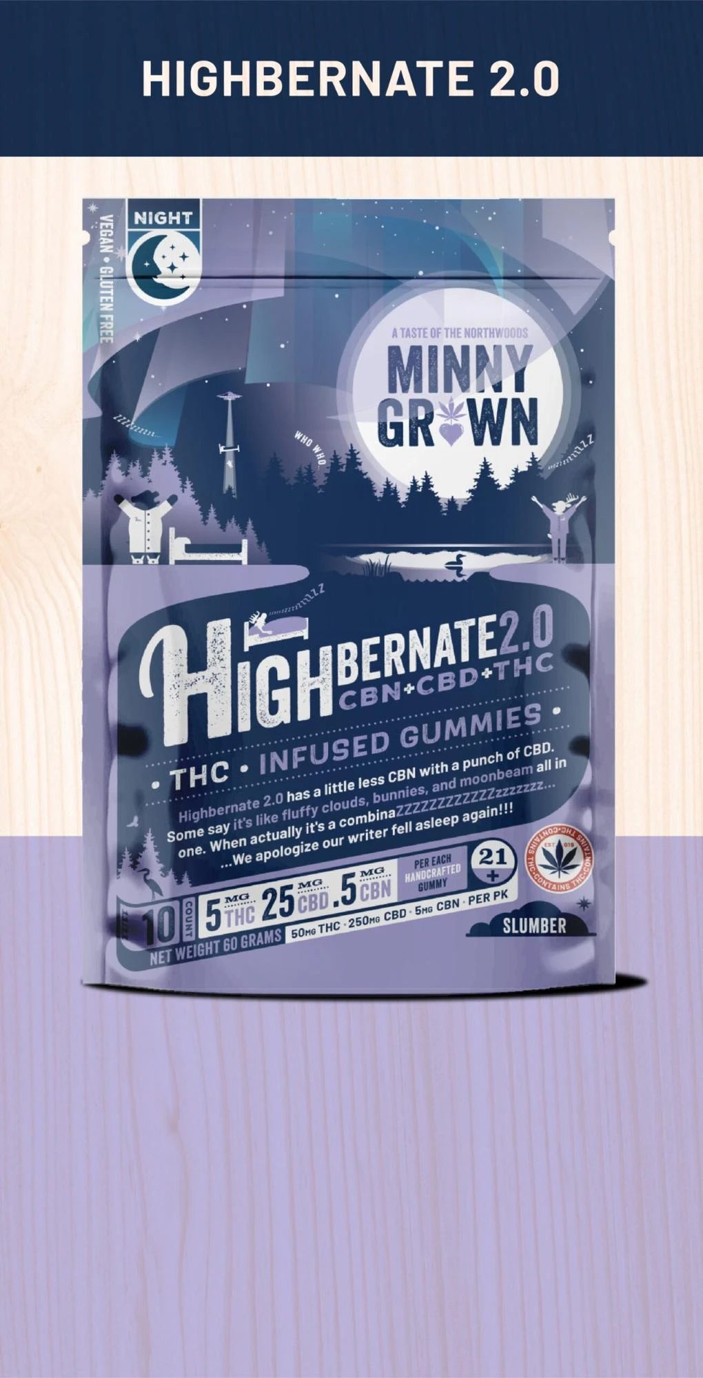 There is nothing like a good nights slumber under the stars. But sometimes it’s not that easy to shut down the old noggin. That’s why Minny Grown’s Highbernate 2.o is here. A combination of 25mg of CBD, 5mg of THC, and 0.5mg of CBN, this product is our best solution for getting a great nights sleep.